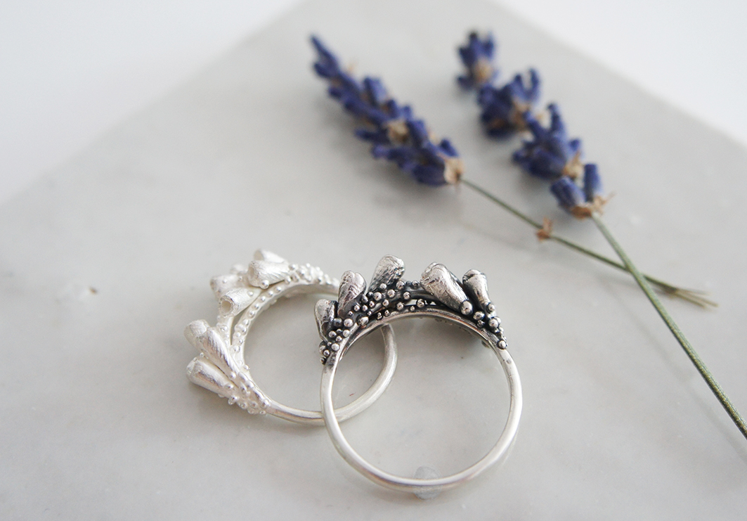 For creating the pieces of this collection I emulated the shapes of some of well known wild flowers I found like the poppy, lavender and foxglove blended with the petals, seeds and textures of other tiny flowers which I didn't even find their names.