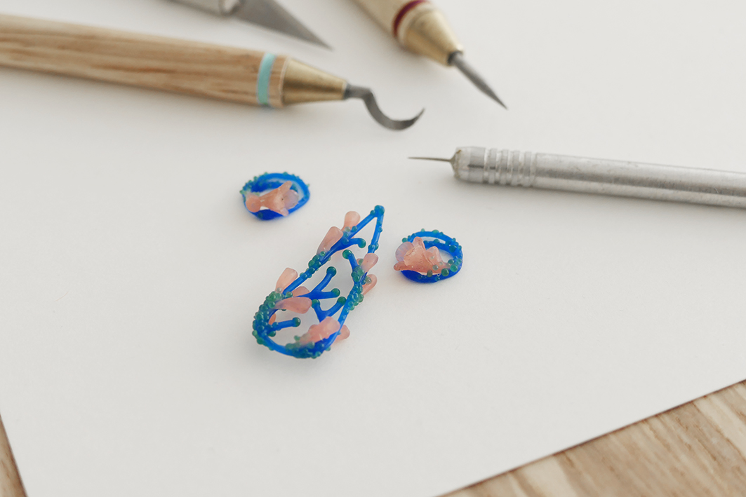 I modeled by hand all the pieces in soft wax, paying special attention in texturing the petals and small flower buds and adding granules like tiny seeds for enriching the texture of every piece.